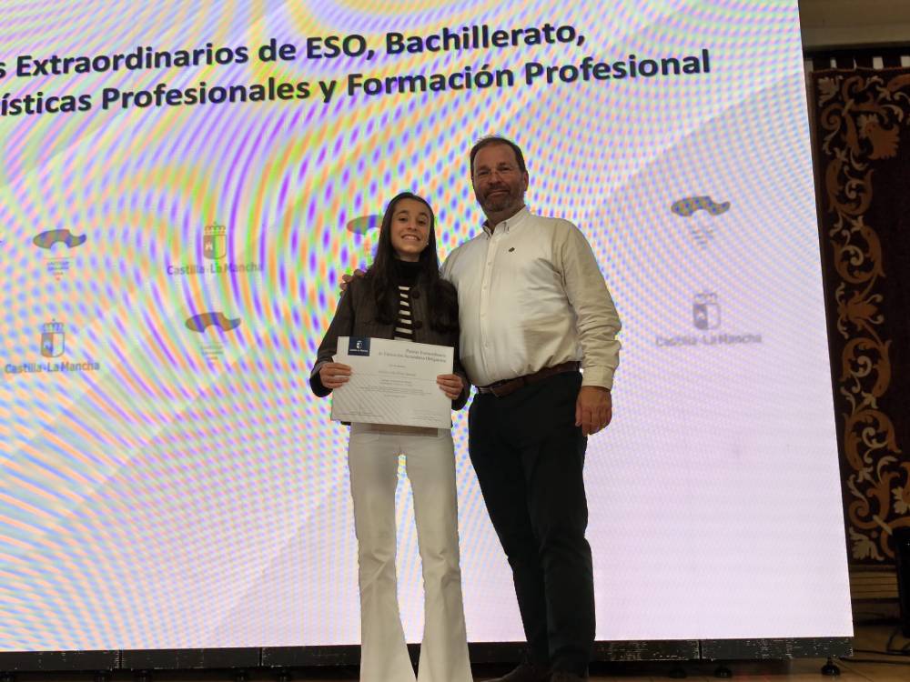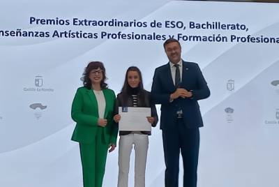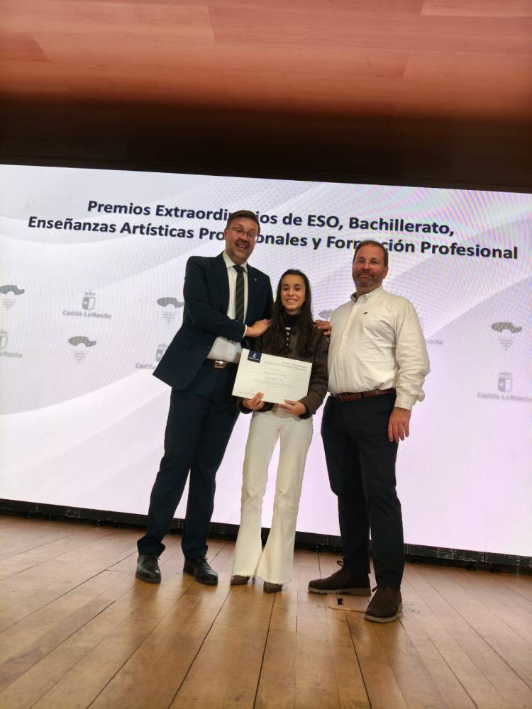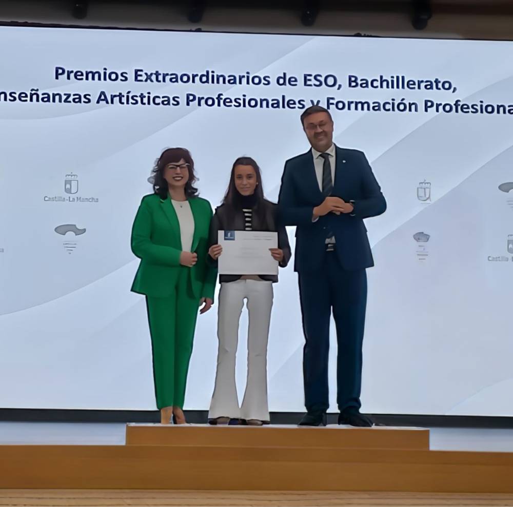 El pasado 3 de diciembre fue el acto de entrega en Toledo de los Premios Extraordinarios de ESO, Bachillerato y Enseñanzas Artísticas Profesionales del curso 2024-2025, entre los que se encontraba nuestra alumna María Caballero García. El consejero de Educación, Cultura y Deportes, Amador Pastor, hizo entrega del premio, definiendo a los estudiantes como ejemplo de toda la comunidad educativa y como el futuro de nuestra región. ¡Enhorabuena, María!