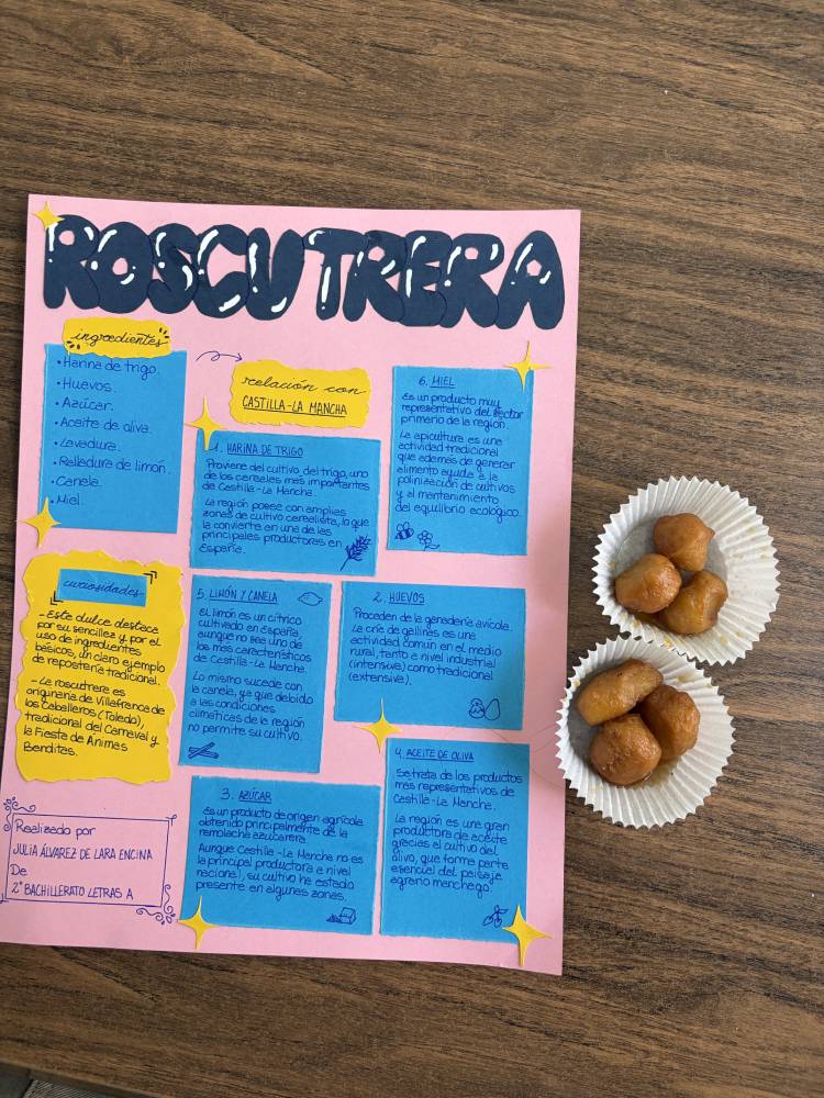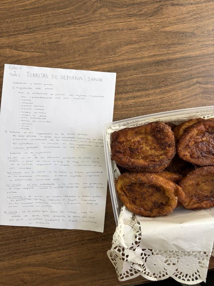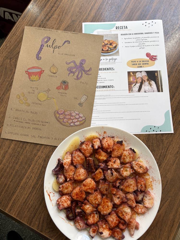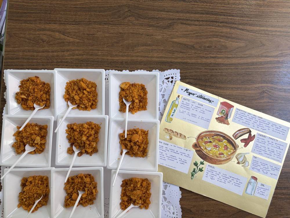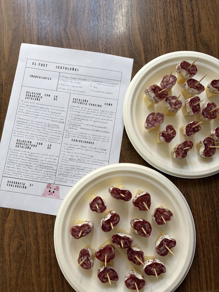 Las alumnas de 2.º de Bachillerato de Humanidades y Ciencias Sociales han realizado una muestra gastronómica en la materia de Geografía, para profundizar en las actividades del sector primario y su diversidad en España. Cada alumna preparaba un plato típico de cada comunidad autónoma y explicaba su relación con la agricultura, la ganadería y la pesca de la región. A continuación, invitaron a la degustación a sus compañeras de Bachillerato de Ciencias y Tecnología.