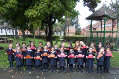 - Uniforme: azul marino de lana o tergal. La falda va nesgada en las costuras y consta de un tablón central y una tabla a cada lado del mismo. La camisa es de rayas azules y blancas y el jersey, de punto liso y con cuello de pico. Calcetinesazul marino y zapatos negros, modelo colegial. El abrigo, azul marino, barbour. Los zapatos son modelo colegial, mocasín o similar, sin cordones; negros.